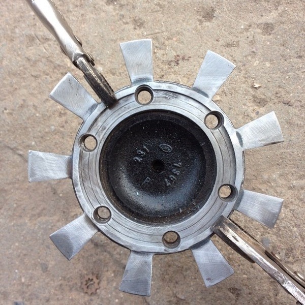 Далее нам нужно снять флянец редуктора от нашей Е21 и примерить венец с лепестками, для того что бы доработать его напильником под отверстия болтов нашего флянца.