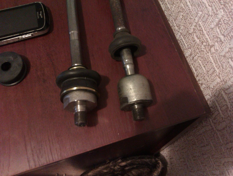 ну вот и приехали зап. части.правда не все.кронштейн сняли-пришлось делать самому,тяга приехала не той фирмы(ну это ладно).резинка рейки тоже одна доехала.жду вторую.Теперь по работе,тяги различны не только наличием пыльника,но и длинной резьбы(фото)