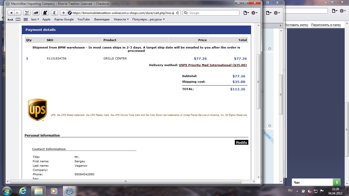 там ups / а у нас он в каждом городе есть , от туда хоть лобовое можно притащить хоть пол кузова23-ий писал(а):этот сайт больше украинцам полезен. ибо в украину гораздо дешевле тащить. со штатами работают 2 украинских перевозчика. мне их сервис очень нра. у них цена до москвы 8 баксов за кило самолетом и 6 баксов за кораблик.