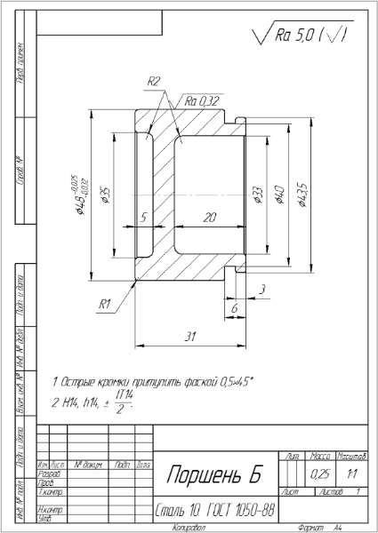 Весьма неплохо, но 2 вопроса, допуска и материалы взяты с учетом именно работы поршня в тормозном механизме? Допуск на внешний диаметр указан с учетом последующие шлифовки? Прост шероховатость 0.32, и сразу токаркой тяжеловато