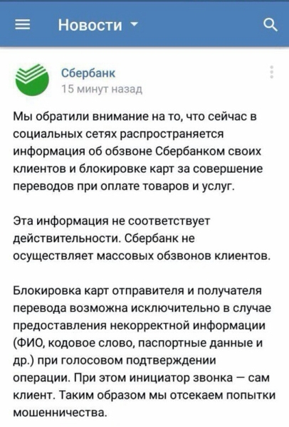 "Будьте бдительны: в социальных сетях распространяется информация о том, что Сбербанк массово обзванивает клиентов для проверки операций по денежным переводам и блокирует карты. Эта информация ложная! Если вам позвонили и сообщили о блокировке карты, знайте — это делают мошенники.