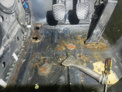 Все внимание пока ей. После покупки еще раз осмотрели днище и сначала порадовались неплохому его состоянию. Но замечал воду под ногами, решил вскрывать. И вот, хотя бывает и хуже. Восстанавливает наш одноклубник Дмитрий (Dizrail). Мне нравится, сразу после сараюшки, заезжает к нему 32?