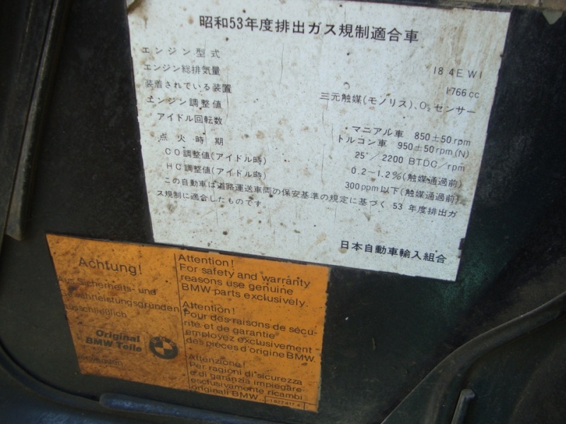 это BMW 3 E21 318i, выпуска 4.10.1982 года, эксклюзивная версия из лимитированной серии(о чем нам повествует заводская табличка на торпеде), 63й автомобиль из 200, изготавливалась серия для поставки в Японию, судя по всему, ибо полно специализированных наклеек на японском, даже на ключах иероглифы выдавлены. В комплектацию входят: