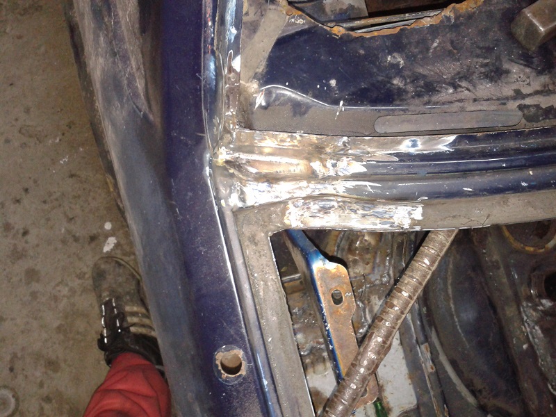 всё это начиналось месяц назад. я не в теме вопроса был про сварку кузова,варил до этого только тигом аргоном алюминий. был у меня сварщик, по рассказам преварил пол-города машин, сразу в бой. посрезал оба порога ( порогов ещё не было), повырезал кучу кузовных элементов, что потом я устал включать свою фантазию. через пару дней пришли пороги и задние арки. сварщик примерил правый порог и арку , и приварил. примерял без двери. нутром я чуял что-то здесь не так. засел на пару дней в интернет, есть очень хороший ресурс по сварному делу, я там только по алюму общался. там есть очень замечательная темка - сварка гнилого авто. всё очень практически детально расписано с фото. итог - мало того, что сварной варил всё сплошными швами( метал конкретно покоробило), так когда я выставил дверь - передняя часть порога ушла вверх на 2см. пришлось частично всё разрезать и осаживать порог получилось в принципе не плохо, а поведенный металл на заднем крыле будем вытягивать обратным молотком.